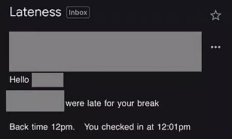 The email from the manager stated clearly: 'Hello. You were late for your break. Back time 12pm. You checked in at 12:01pm.' It proceeded to instruct the employee to 'adhere to the attendance policy,' detailing expectations regarding punctuality, shift start times, and the necessity of notifying managers about any lateness.