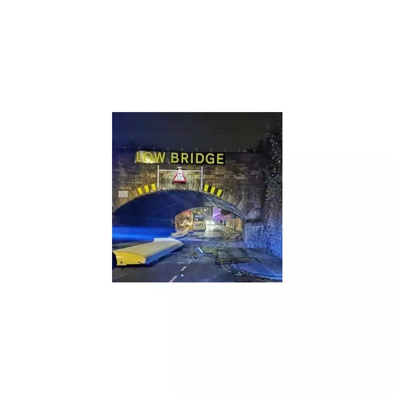 The bridge involved is clearly marked as a low bridge with a height of 3.7 metres. The force of the impact was so severe that the entire roof of the vehicle was ripped clean off, scattering debris across the road.