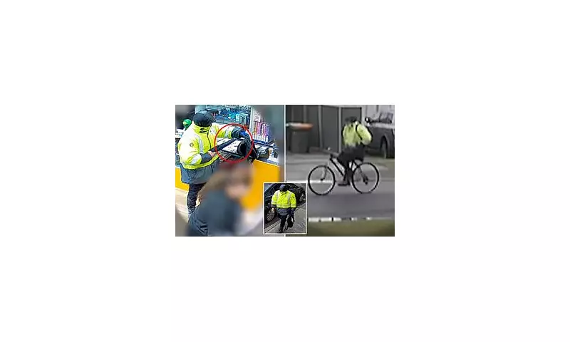 The man was seen walking towards the shop wearing distinctive clothing designed to conceal his identity. His outfit consisted of a yellow, silver, and black high-visibility jacket, which was pulled up to cover his face, along with black jeans and black lace-up boots. He was also carrying a black Adidas bag.