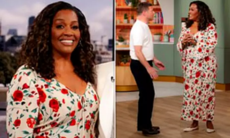 Alison Hammond looked absolutely stunning as she confidently displayed her remarkable 11 stone weight loss during Friday's broadcast of This Morning. The beloved ITV presenter, aged 51, chose a beautiful rose print midi dress from the fashion brand Rixo, which featured elegant fluted sleeves and a vibrant red floral pattern. She completed her chic ensemble with a pair of crisp white shoes, adding a glamorous touch with expertly applied makeup and her hair styled into soft, natural curls.