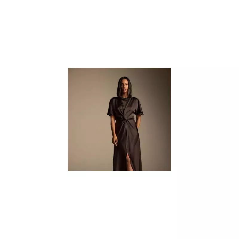 Key design features make this an ideal choice for any festive occasion, from office parties to family gatherings. It boasts floaty short sleeves and a midi hemline with a front slit for ease of movement. The clever twist front is the secret to its success, skimming over the tummy to create a flattering hourglass silhouette. The draping fabric helps to conceal any bloating, while tailored details at the back ensure a stunning drape. The hammered satin material elevates the entire look, adding a touch of elegance that belies its affordable price tag.