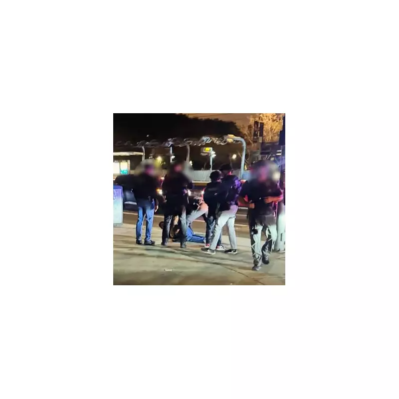 Dramatic photographs released by authorities show the suspect lying face down on the ground in handcuffs, wearing jeans, a striped jacket, and a baseball cap, before being placed in a police vehicle.