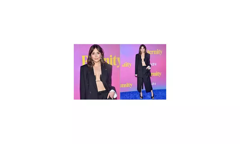 Elizabeth Olsen made a striking appearance on the red carpet in New York City this Saturday, showcasing a bold fashion choice for the screening of her upcoming romantic comedy Eternity.