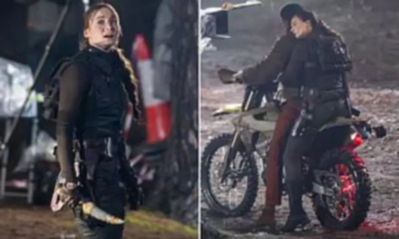 The filming location, typically quiet, was illuminated by floodlights and turned into a challenging environment by persistent rain. Turner appeared visibly worn as she got into character, crouching to catch her breath after running through the woods before Bobb-Semple arrived to whisk her away on the motorbike.