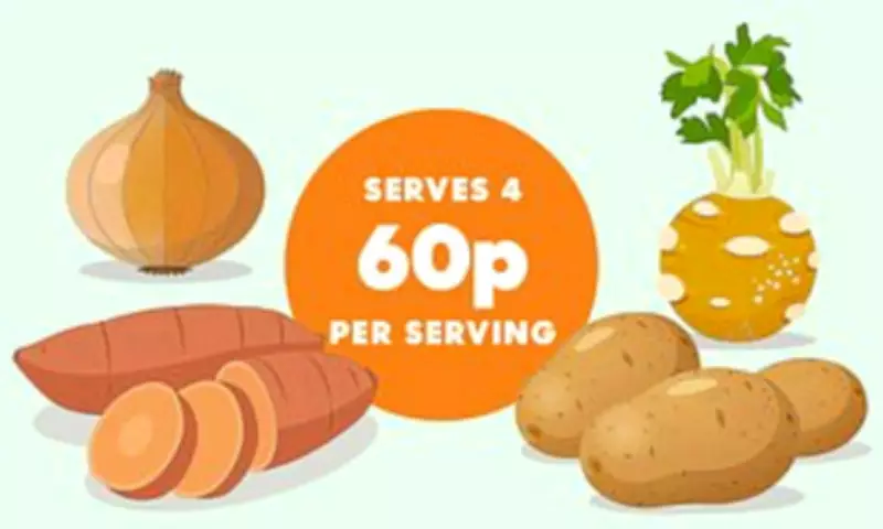 - Ingredients: 1 large onion (26p), ½ celeriac (£1.37), 350g sweet potatoes (46p), 350g white potatoes (32p), butter, chicken stock or bone broth (200ml), optional thyme sprigs, salt, and pepper.