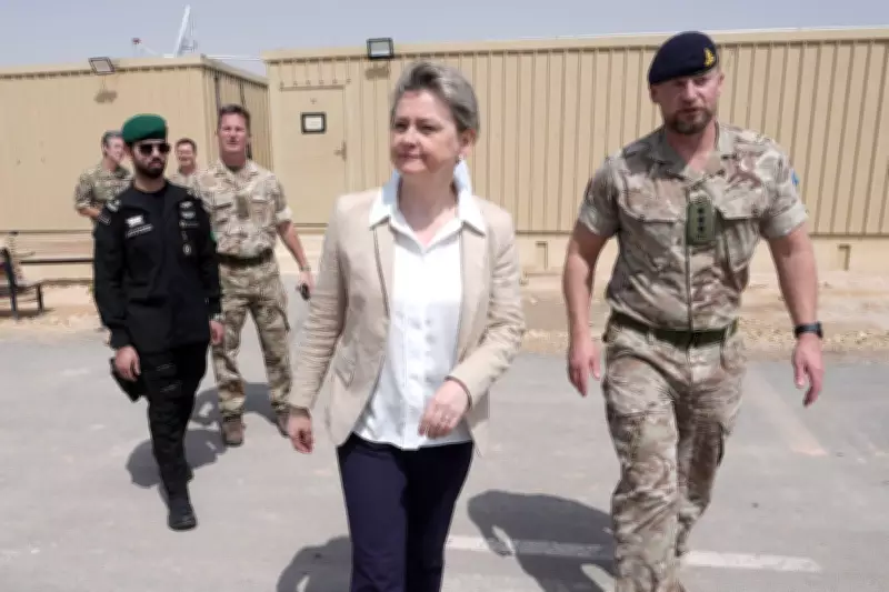 Foreign Secretary Cooper visited a British military base on the edge of Riyadh, where she spoke with troops from 9 (Plassey) Battery, Royal Artillery who are protecting Saudi Arabia's critical national infrastructure. This deployment began in 2022 following a one-way drone attack on the country.