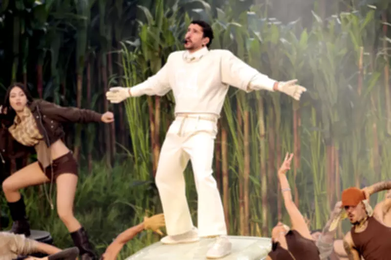 The Grammy-winning artist began his performance standing amidst a high-grass set that evoked the atmosphere of his Puerto Rico residency. The elaborate stage design featured a barber shop, a liquor store, and the iconic "casita"—the small house where he has regularly hosted celebrity guests. This visually stunning backdrop set the scene for a show that would blend music, culture, and a surprising dose of romance.