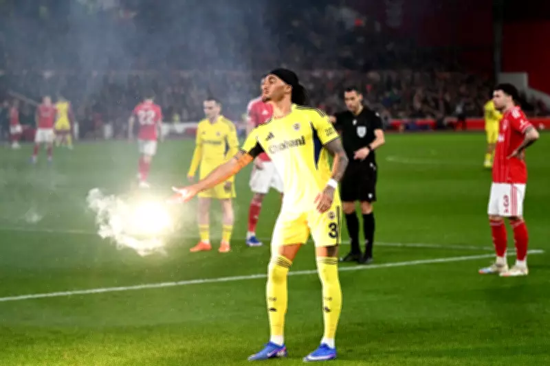 Nottingham Forest players were forced to take evasive action as fireworks were launched onto the pitch by Fenerbahce supporters during the Europa League play-off second leg at the City Ground. The incident occurred moments after kick-off, leading to a significant three-minute delay in the match.
