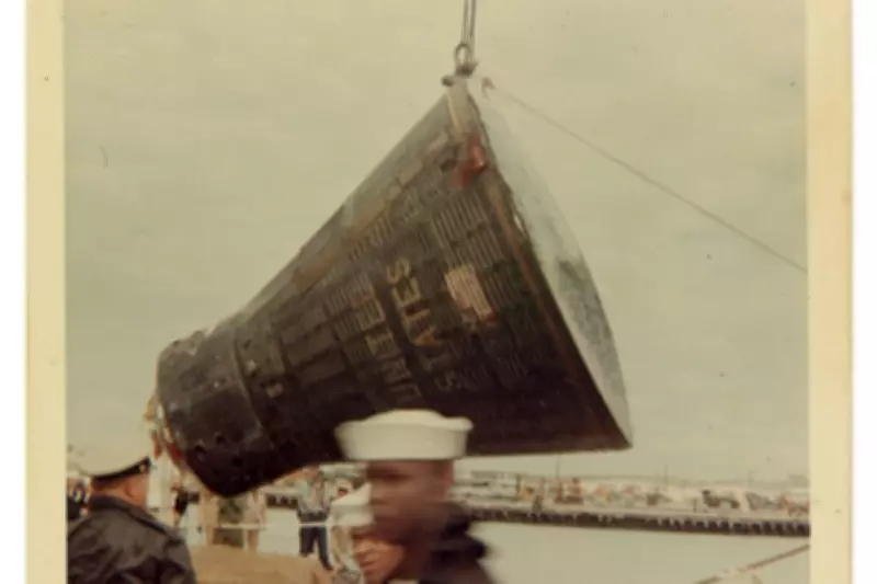 McQueeney's widow donated the collection, which includes images of Armstrong and fellow astronaut David Scott on the deck of a U.S. Navy vessel, waving to service members on land. One striking photo shows the Gemini 8 capsule being lifted into the air for transport, a visual testament to the mission's abrupt conclusion.
