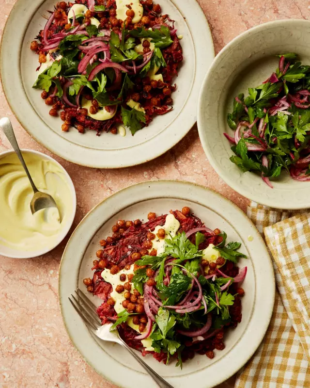 For the rösti, 300g of grated root vegetables are combined with 80g of thinly sliced red onion, two tablespoons of plain flour, and one egg. The mixture is then fried in neutral oil over a low-medium heat for five to seven minutes on each side until golden and crisp. The dish is assembled by placing the rösti on a platter, drizzling with the mustard aïoli, and generously topping with the crisp chickpeas and the pickled salad.