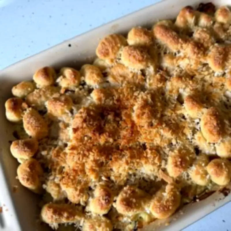 After a swift drain, the gnocchi is arranged atop the pie filling. To enhance the dish, generous amounts of grated Parmesan cheese are added, along with panko breadcrumbs for extra texture. This combination creates a crunchy shell that hides a pillowy centre, reminiscent of miniature roast potatoes.
