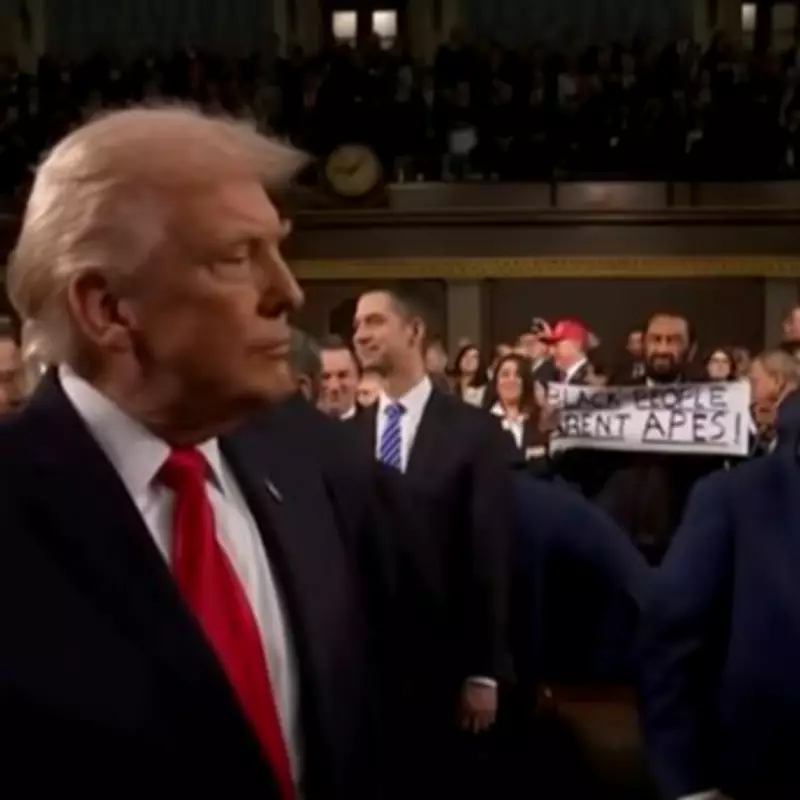 Donald Trump was confronted by a sign reading "black people are not apes" as he arrived to deliver his State of the Union speech tonight. The protest was led by Democrat House member Al Green, who held up the placard as Trump walked into the House of Representatives chamber for the annual address to a joint session of Congress.