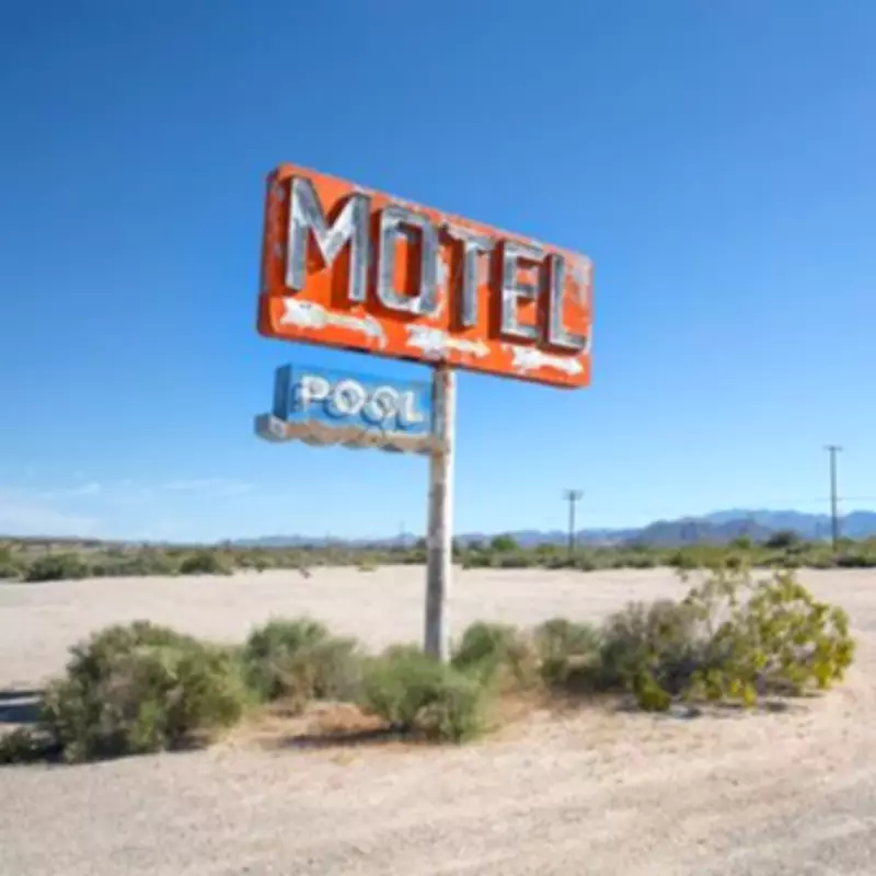 One particularly evocative photograph captured inside a guest bedroom displays two mattresses on twin beds, both appearing to be in great condition. The room's interior walls are decorated in a beige tone, complemented by walnut furnishings including bed frames and a writing desk. Notably, a small microwave within the room matches the motel's signature turquoise colour.
